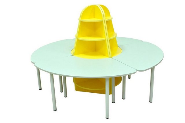 Дидактический набор мебели «Ромашка». Собран из четырёх стоек угловых и четырёх столов дидактических, представляет собой круговую композицию. Стойки скрепляются между собой межсекционными стяжками. Можно установить две стойки и два стола к стене или одну стойку и один стол в угол помещения. Стойки угловые изготовлены из ламинированной ДСП 16мм. Кромки щитовых элементов облицованы кромочным пластиком толщиной 2мм. Дидактический стол изготавливается на металлическом каркасе из стальных труб круглого сечения Ø32х2,0 и уголка сечением 25х25х1,5 с радиусной столешницей из плиты ДСП 16мм с ламинированным покрытием. Кромки столешницы облицованы кромочным пластиком толщиной 2 мм. Металлический каркас имеет сварную конструкцию со стойким порошковым полимерным покрытием. На свободных концах труб установлены заглушки из ударопрочных полимеров. Цвет на выбор.