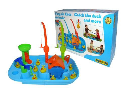 "Суть игры ""Поймай уточку"" заключается в том, чтобы удочками поймать из воды как можно больше уточек. Всего в наборе 2 удочки и 12 уточек. Уточки при этом движутся в водичке от работы моторчика, который находится в домике. Включается моторчик путем нажатия кнопки на крыше домика. Также уточек можно ловить и подъемным краном. В наборе имеется водяная мельница, заслонки для воды. Игра будет интересна и мальчикам и девочкам. Во время игры детки развивают моторику рук, координацию движений, усидчивость."