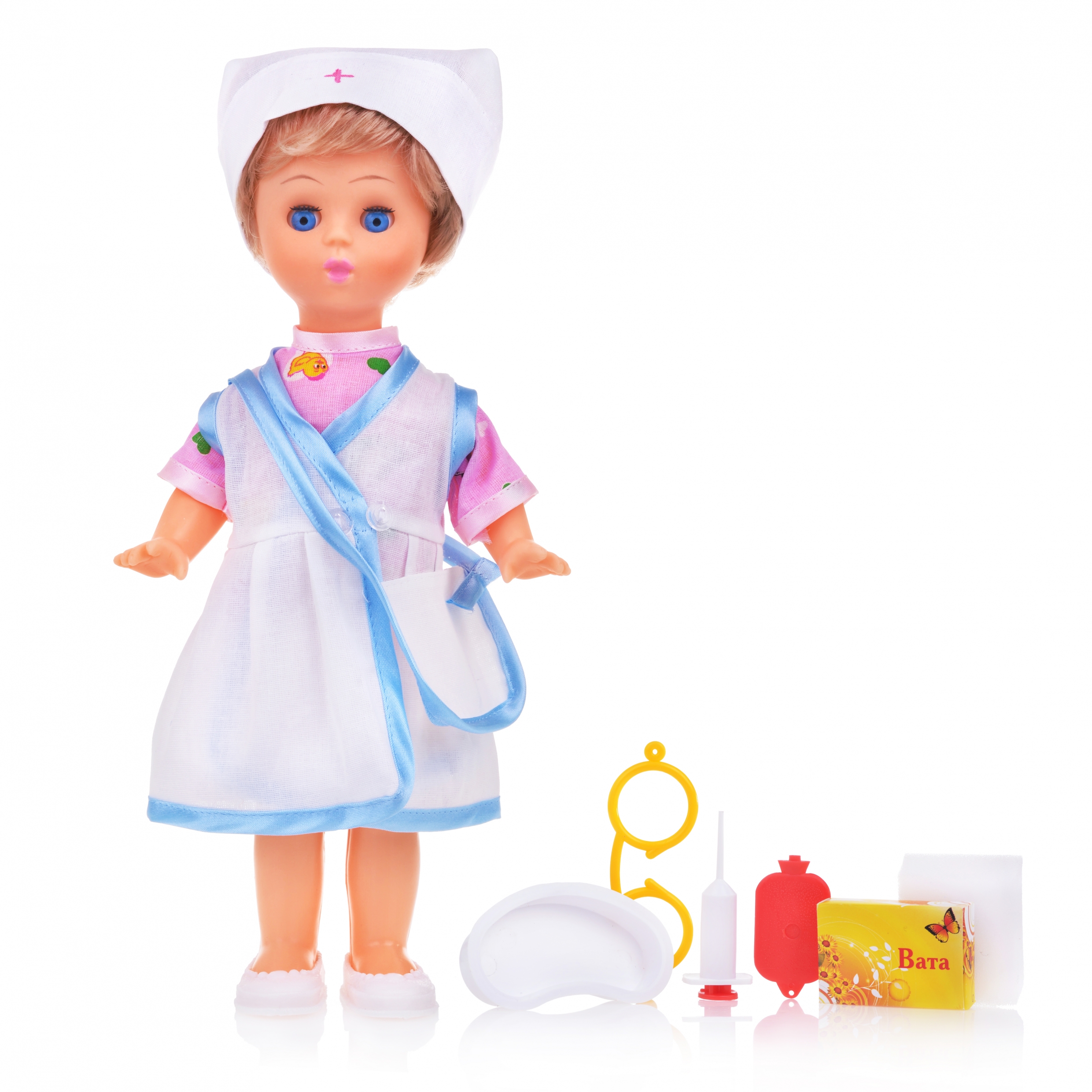 Голова и руки мягкие, ноги и туловище твердые. Волосы короткие. Одежда: шапочка, кофточка, медицинский халат (цвета одежды могут изменяться в зависимости от материала) и тапочки. С набором медицинских принадлежнойстей. В пакете.